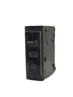 The GE TQL1140 is a single-pole 40A thermal-magnetic circuit breaker designed for use in GE load centers. This plug-in breaker operates at 120/240V AC and provides essential overcurrent protection for residential or light commercial electrical systems, suitable for applications requiring standard 40A protection.